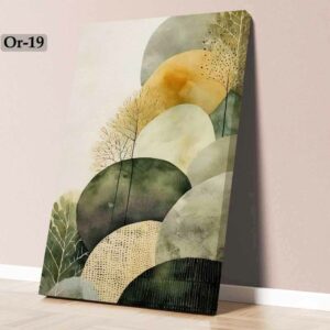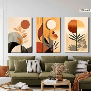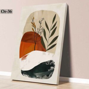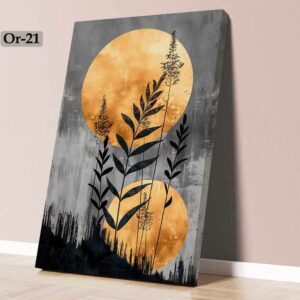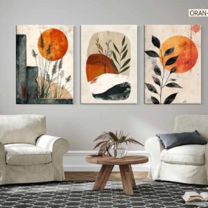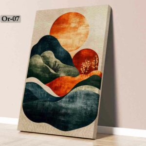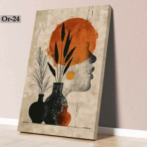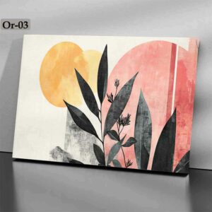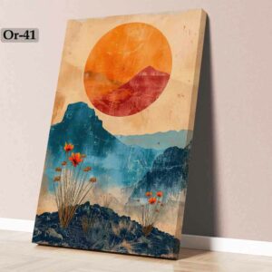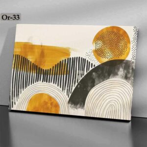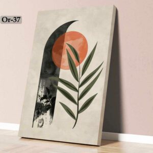 œuvre abstraite captivante. Combinant des formes géométriques audacieuses avec des teintes chaudes d’orange, de noir profond et de beige texturé, cette pièce évoque un paysage stylisé aux accents solaires. créant un équilibre parfait entre nature et abstraction. Idéal pour les les espaces minimalistes à la recherche de caractère