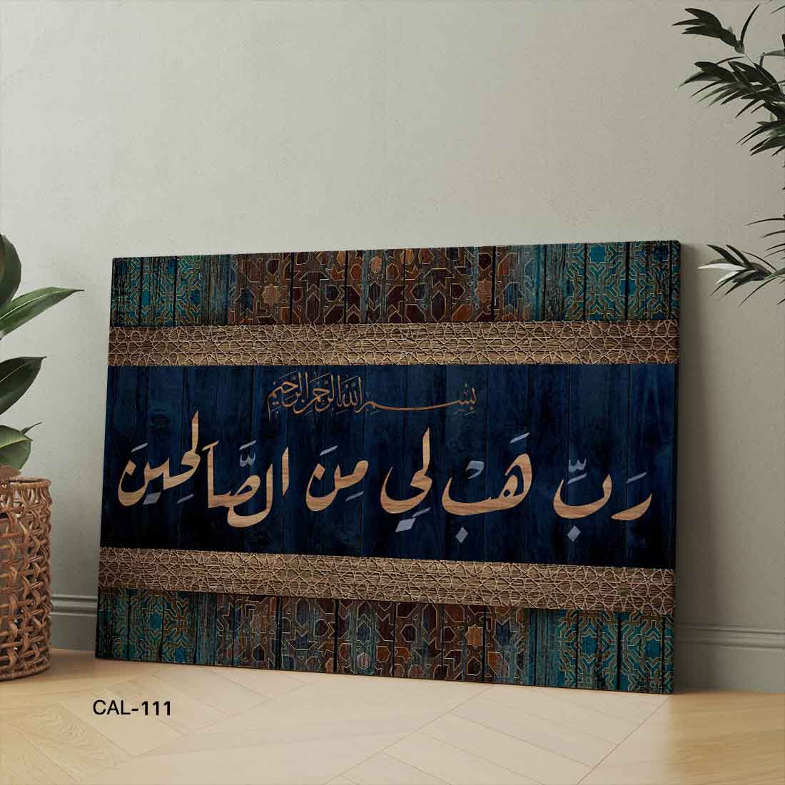 ALIPRINT tableaux calligraphie islamique en algerie Tableau de calligraphie islamique avec des motifs géométriques, textes arabes dorés sur fond bleu élégant.