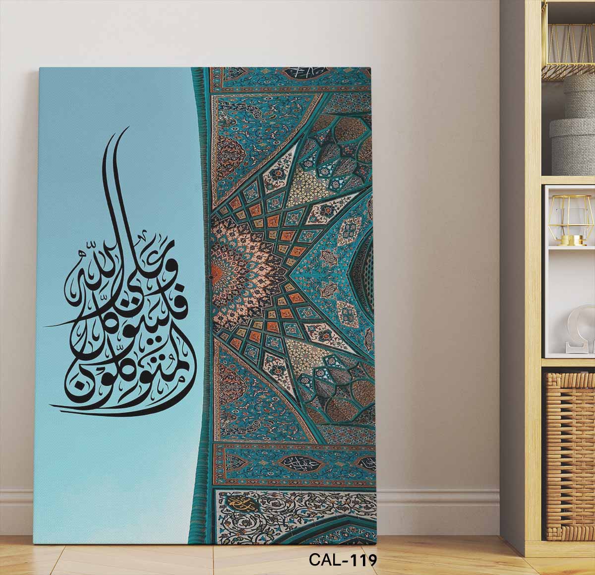 ALIPRINT tableaux calligraphie islamique en algerie Tableau moderne de calligraphie islamique avec motif géométrique et couleurs vibrantes bleu et turquoise.