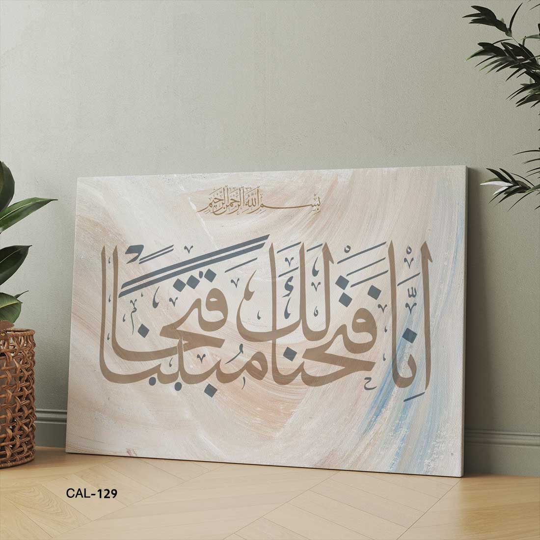 • ALIPRINT tableaux calligraphie islamique en algerie Tableau de calligraphie islamique élégante avec cadre orné, posé sur un sol en bois à côté d'une plante verte.