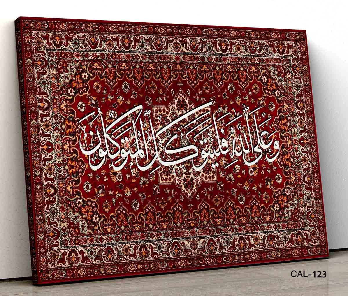 ALIPRINT tableaux calligraphie islamique en algerie Tableau de calligraphie islamique sur fond de tapis rouge. Décoratif avec motifs floraux et arabesques raffinées.