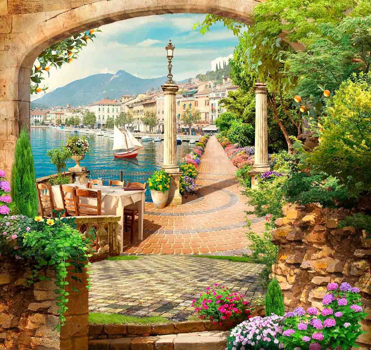 ALIPRINT Papier peint panoramique avec paysage méditerranéen, escalier en pierre, fleurs colorées et montagnes verdoyantes, ajoutant une touche naturelle au salon. AlgerieALIPRINT Vieille ville méditerranéenne pittoresque, escaliers de pierre, arcs fleuris, montagnes verdoyantes, paysage serein, idéal pour papier peint mural. Algerie