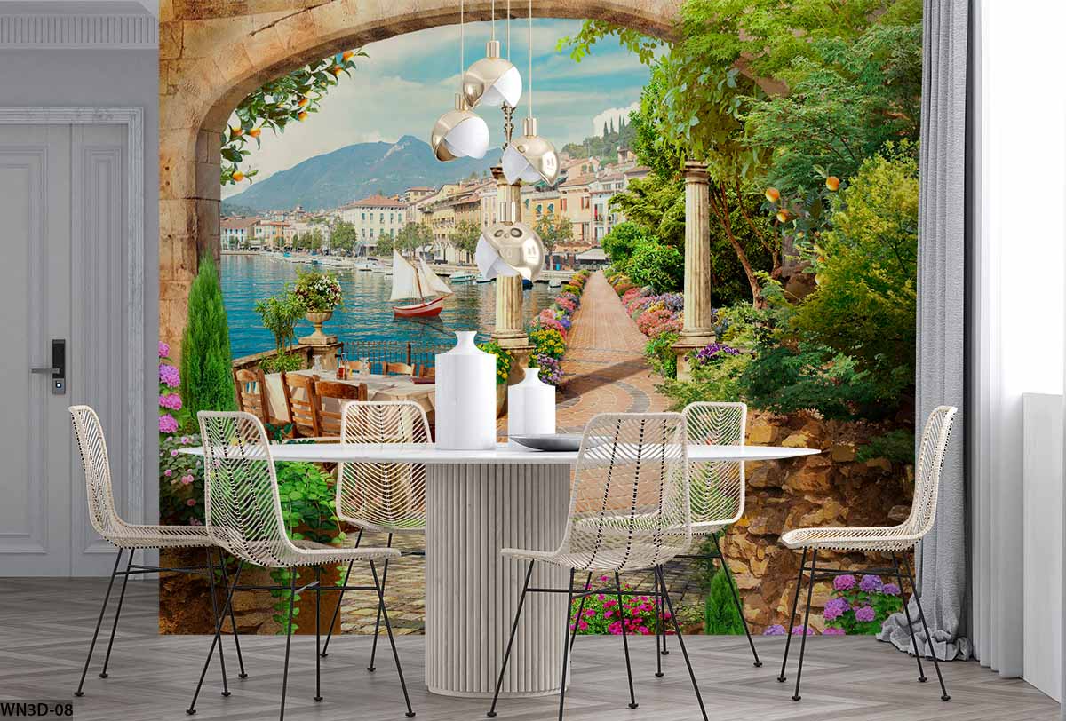 ALIPRINT Papier peint panoramique de paysage naturel, décor mural avec arches, fleurs et cascade, créant une ambiance luxuriante et apaisante dans la salle à manger. AlgerieALIPRINT Jardin idyllique avec fontaine, arches en pierre, montagnes et cascade. Paysage naturel enchanteur pour papier peint floral et décoratif. Algerie
