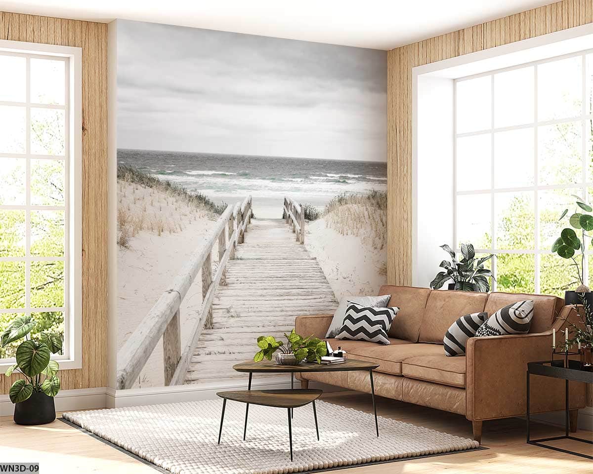 ALIPRINT Salon moderne avec papier peint de plage, promenade en bois menant à l'océan, décor élégant, ambiance sereine et lumineuse, style naturel. Algerie