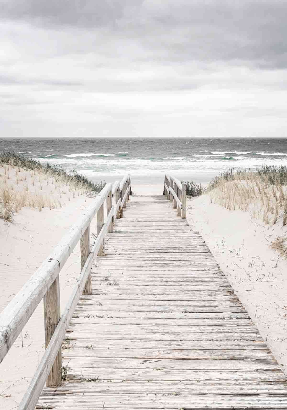 ALIPRINT Passerelle en bois menant à la plage, sable blanc et océan, fond dramatique de ciel nuageux. Paysage côtier inspirant pour fond d'écran. Algerie