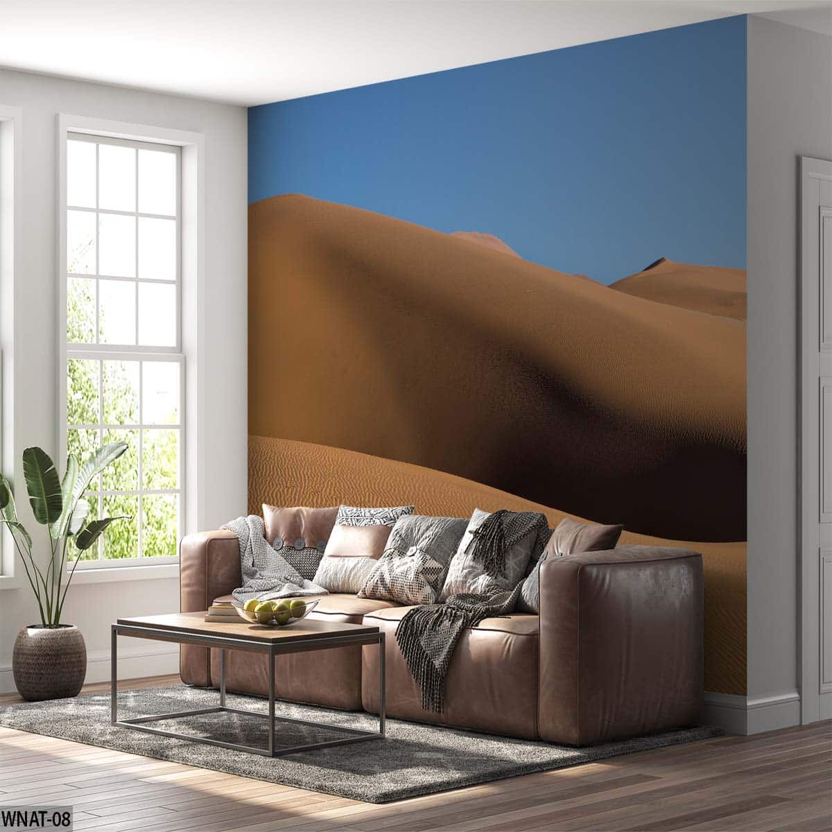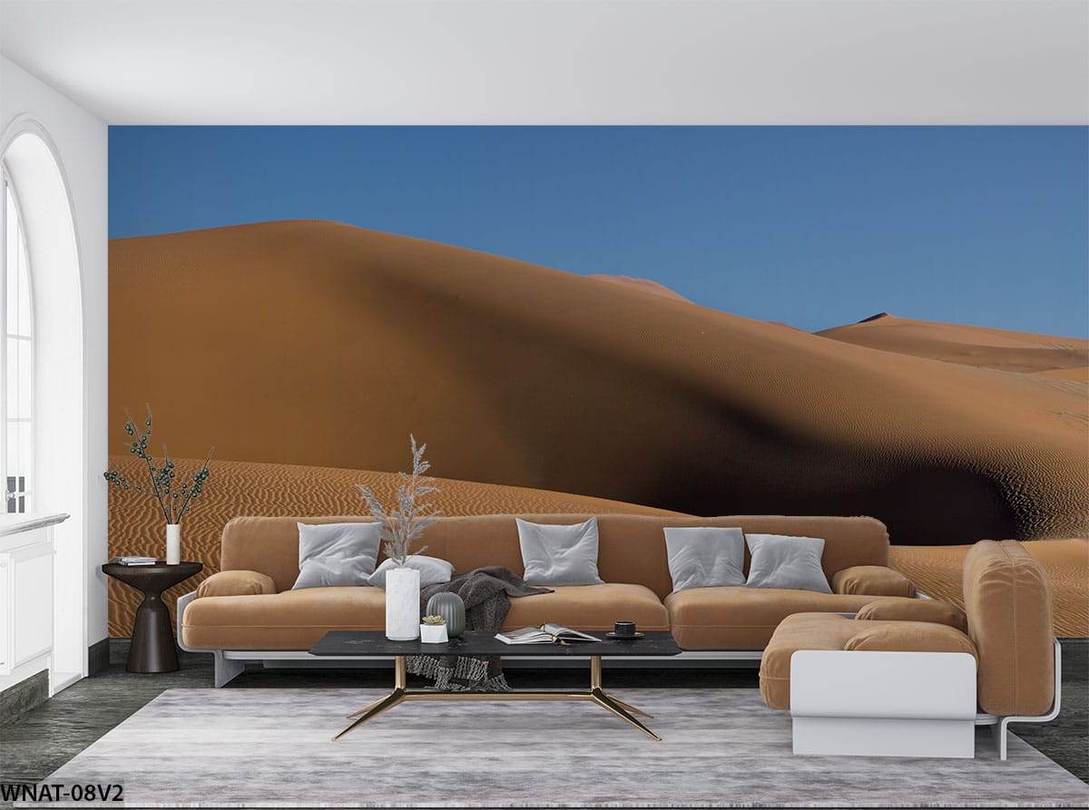 ALIPRINT Papier peint salon avec motif de dunes de sable, ambiance désertique, canapé confortable, décoration intérieure moderne, murale paysage désertique. Algerie