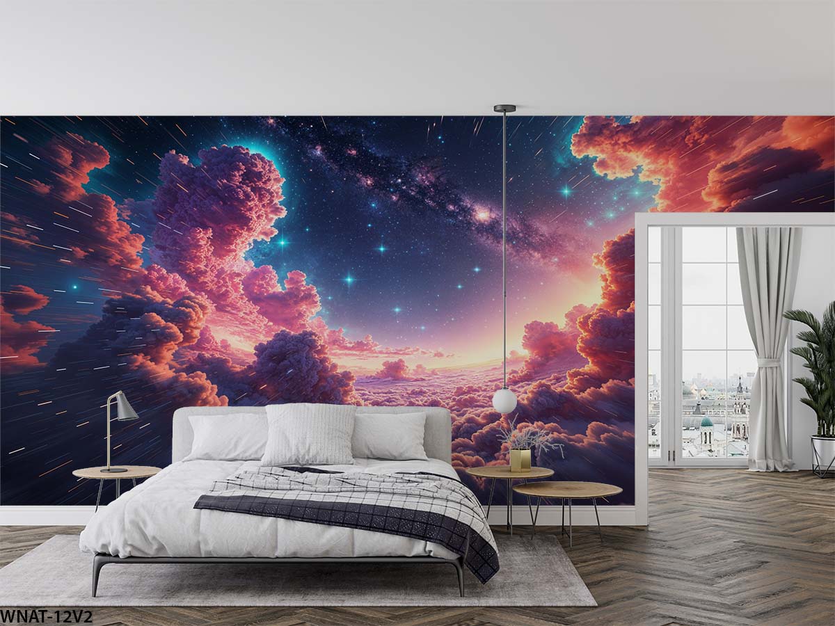 ALIPRINT Papier peint mural avec ciel étoilé et nuages colorés, créant une atmosphère céleste et relaxante dans la chambre moderne. Décoration intérieure unique. Algerie