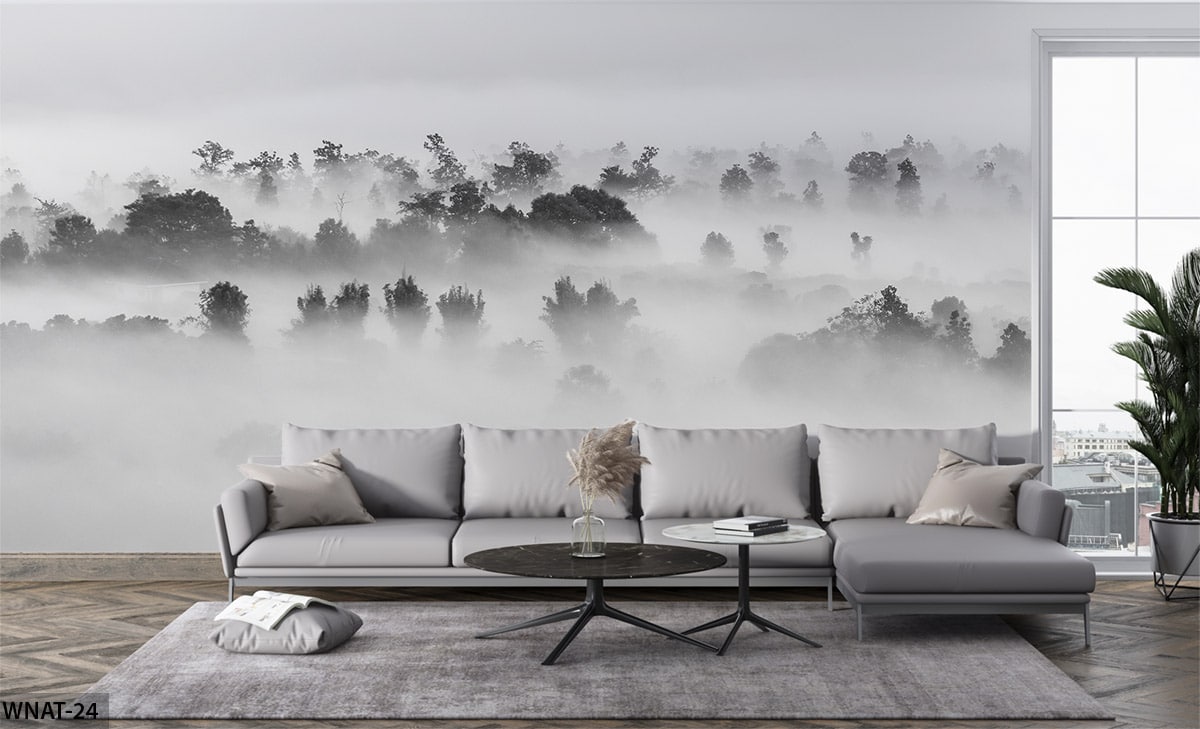ALIPRINT Papier peint nature brumeuse forêt, décoration intérieure moderne, salon élégant, canapé gris, tendance design, ambiance apaisante. Algerie