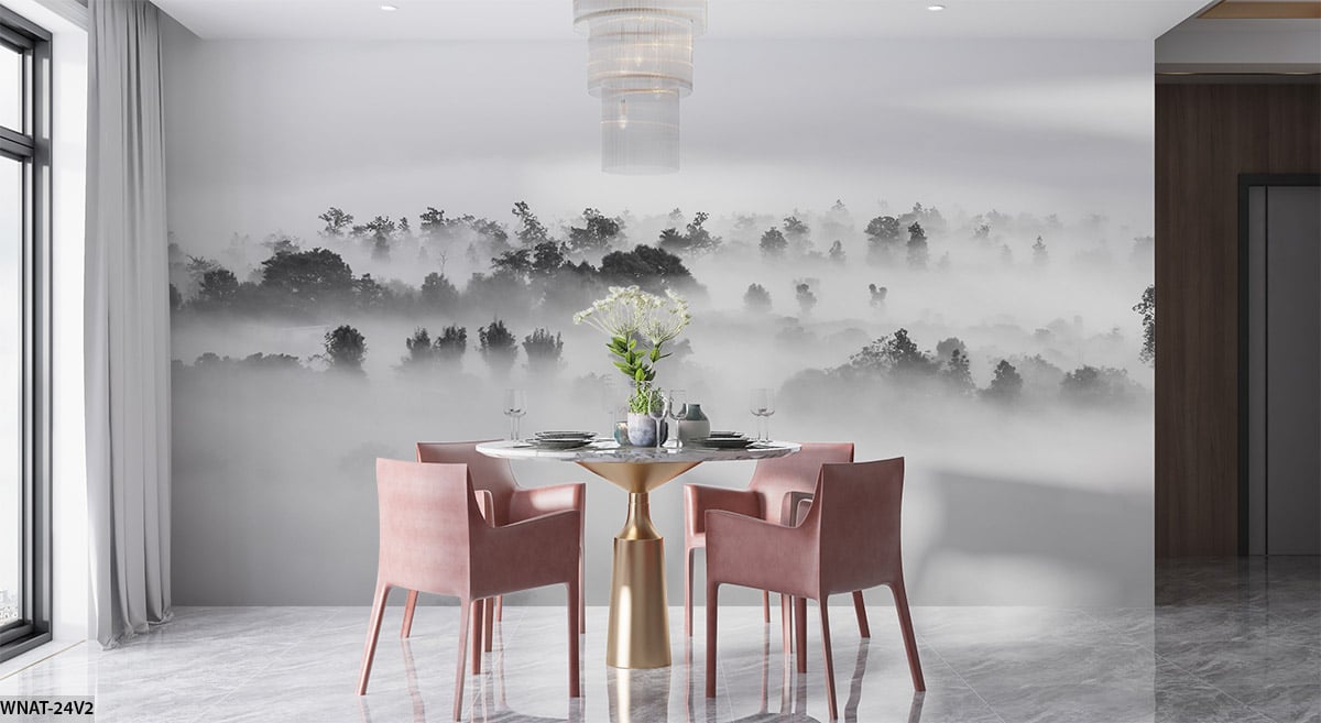ALIPRINT Papier peint paysage brumeux, accent moderne pour intérieur. Salle à manger élégante avec table dorée, chaises roses. Ambiance apaisante. Algerie