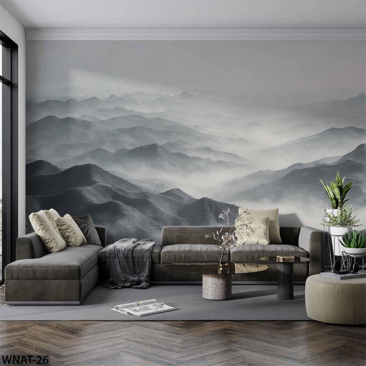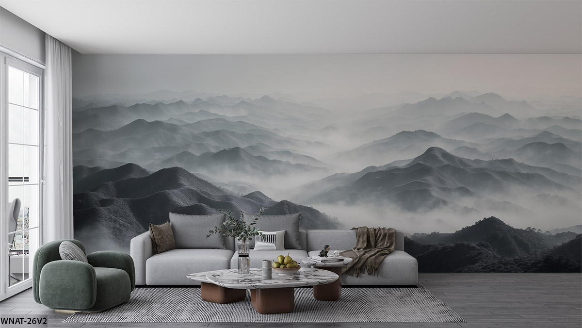 ALIPRINT Papier peint panoramique de montagnes brumeuses dans un salon moderne, créant une ambiance sereine et élégante. Décoration murale nature chic. Algerie