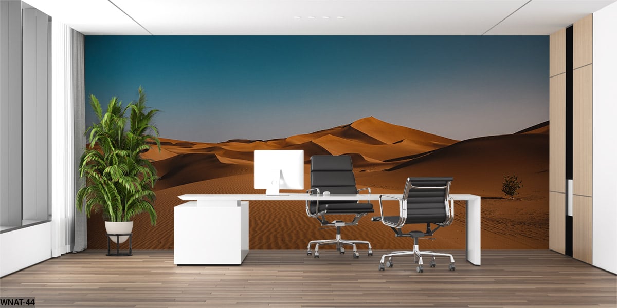 ALIPRINT Bureau moderne avec papier peint désertique, dunes de sable, plante verte, et mobilier blanc. Idéal pour décoration inspirante et apaisante. Algerie