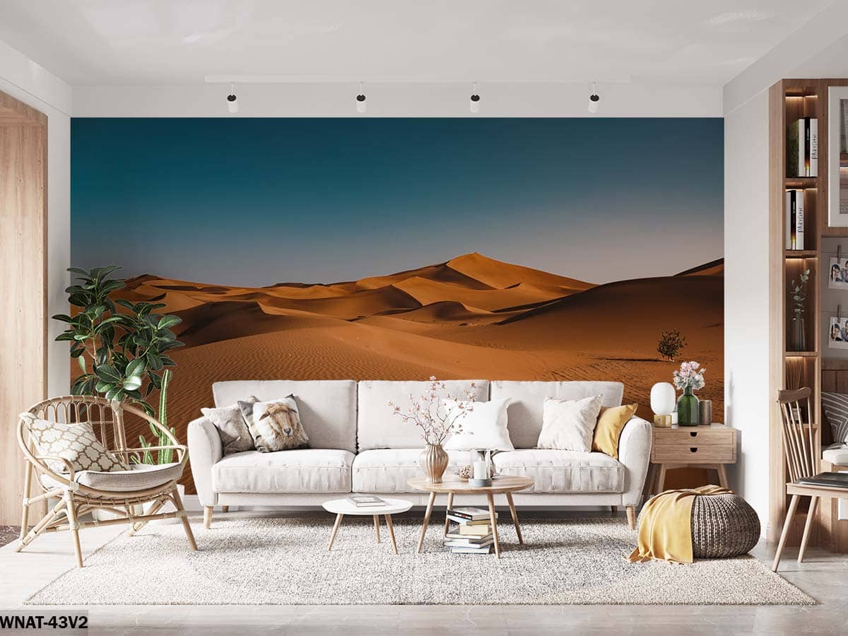 ALIPRINT Papier peint désert Sahara dans salon moderne, rehaussant la déco intérieure avec des tons chauds et naturels, idéal pour un style apaisant. Algerie