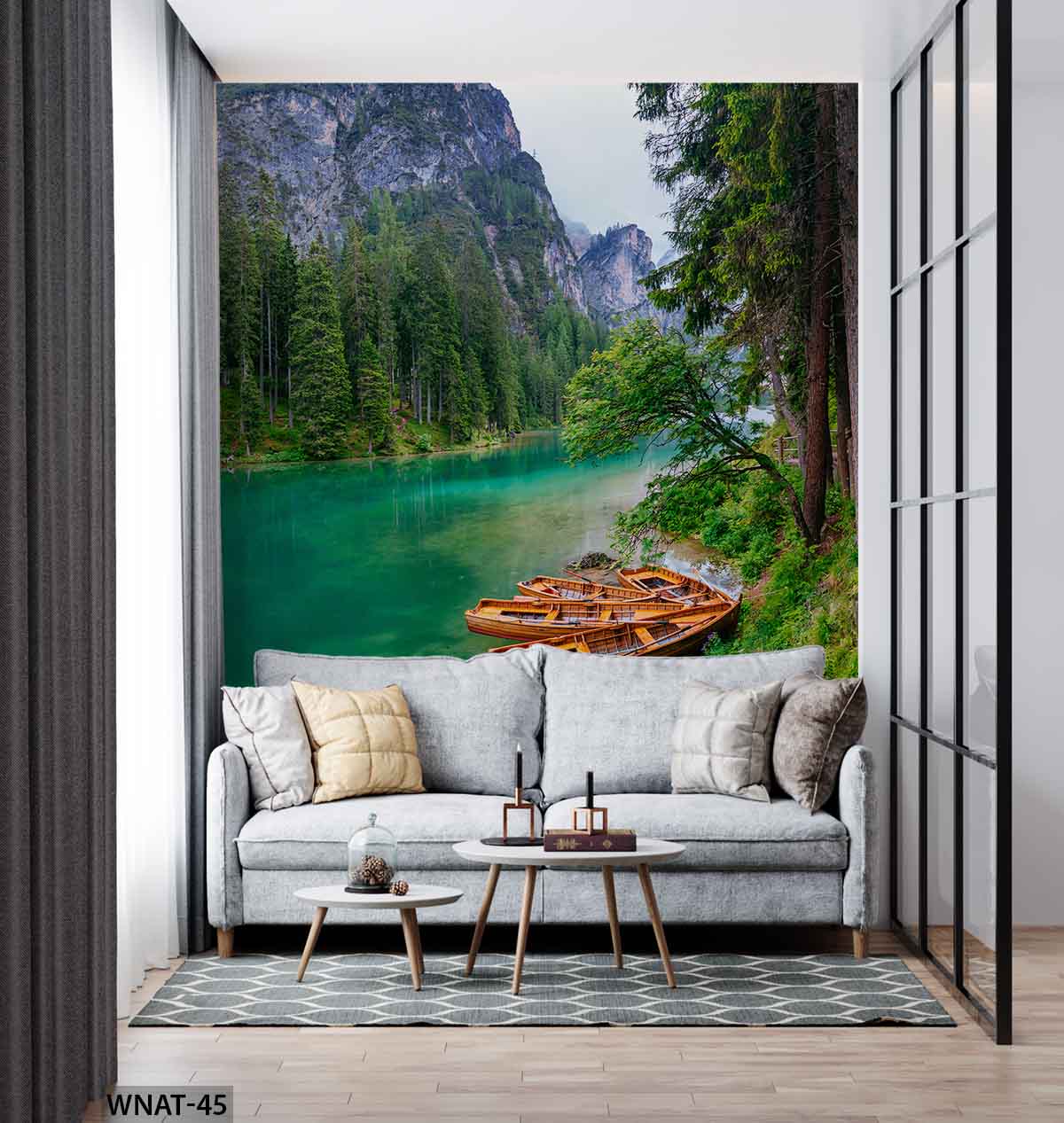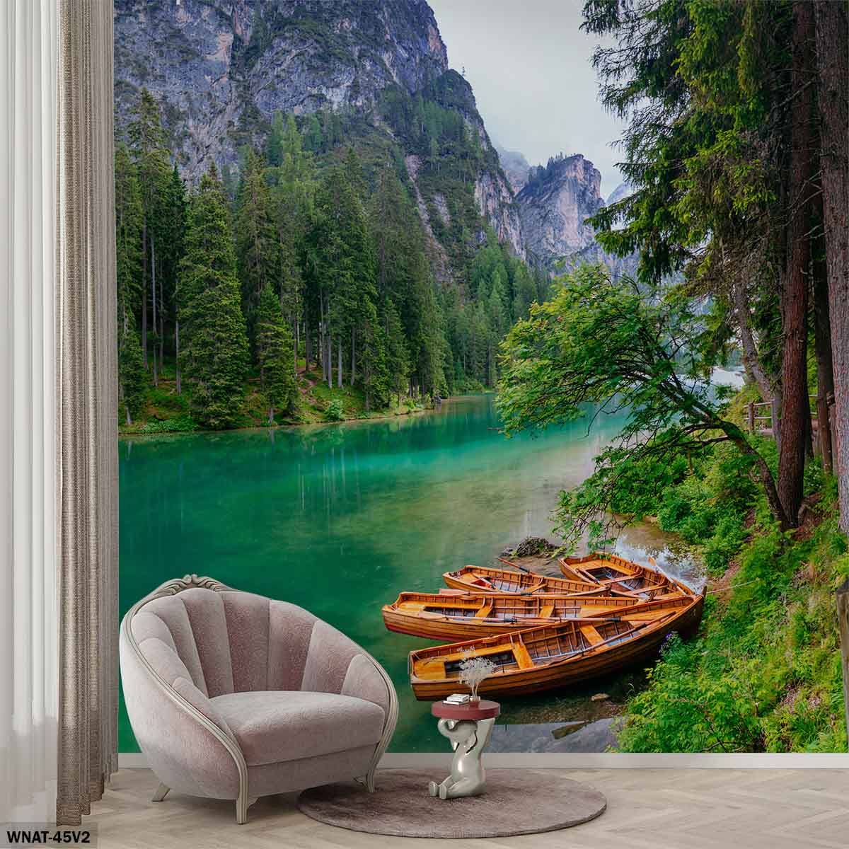 ALIPRINT Papier peint paysage montagne avec lac émeraude, barques en bois et forêt, parfait pour déco salon moderne et ambiance nature relaxante. Algerie